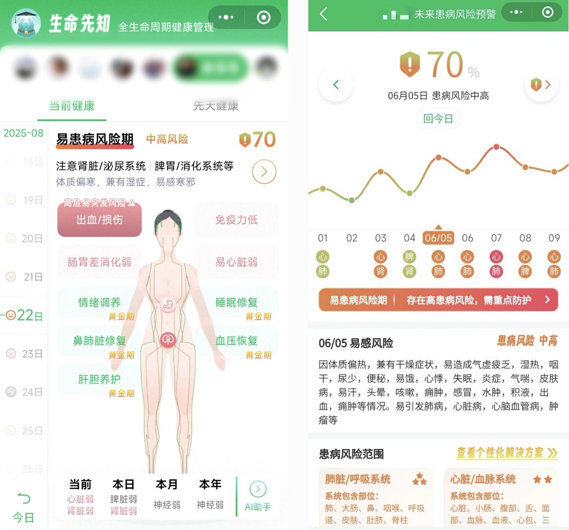 精准未来健康预测:基于“八息象数”非遗算法与AI,提供从年、月、日到小时级别的个体健康趋势与风险预报。