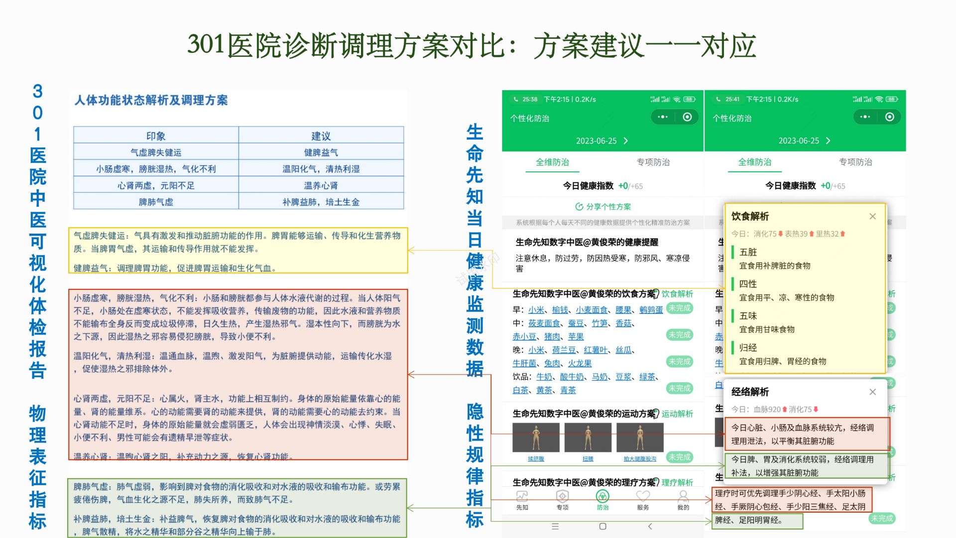 对比结果:系统指示的“脾胃虚弱”、“心肺功能偏弱”等隐性规律指标,与301医院西医检测的物理表征指标高度吻合。在双方开具的诊断调理方案中,方案建议也一一对应,且生命先知系统的建议更加完善,形成了执行的指导方案。